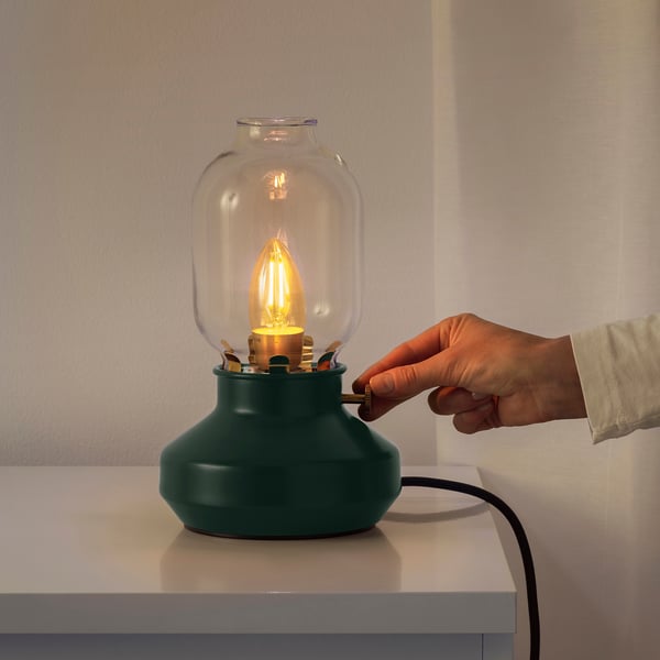 Tarnaby Table Lamp Ikea. It's only $25 and the base is metal, the it's small so perfect for a table but it's so sturdy and well made. Can only be used with light bulbs that are dimmable.