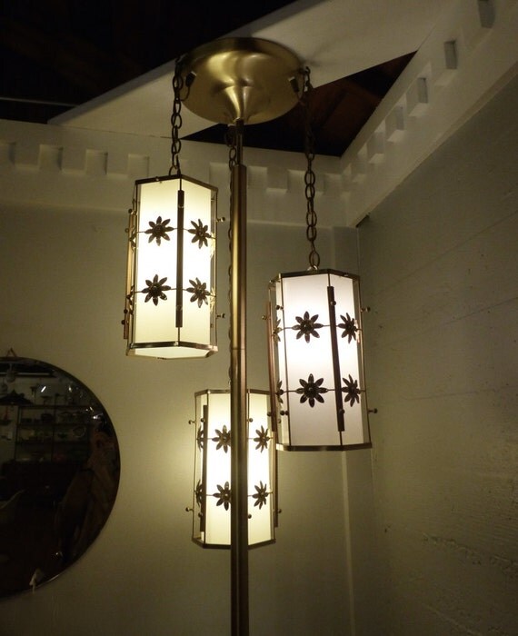 Vintage 3 Light Pole Lamp. Vintage retro mid century floor ceiling tension pole lamp 3 light modern. Vintage two globe tension pole lamp white glass pine cone globes floor light.